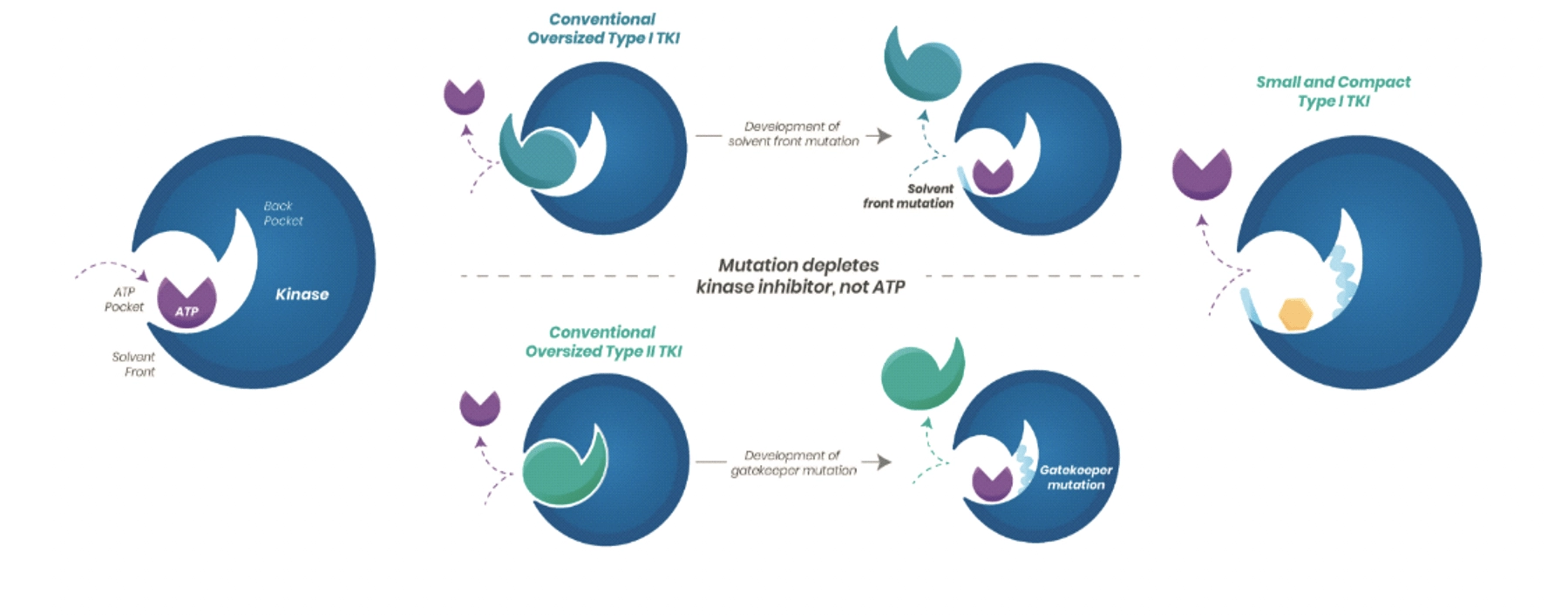 A common problem that we face is that cancer becomes resistant to our TKIs (Crizotinib, Brigatinib, Alectinib, Ceritinib, and Lorlatinib) over time. There are two known mechanisms of resistance so far. One is for the cancer cells to activate an alternative bypass pathway such as EGFR, cMET, KRAS, or AXL to allow cancers to continue to grow. Alternatively, a secondary mutation in the aberrant ALK fusion can sidestep the efficient TKIs with secondary compound mutations (C1156Y + L1198F, or I1171N + L1256F, or I1171N + L1198F, or I1171N + L1196M, or G1202R + L1196M). The letters in front of the numbers indicate the amino acid. The numbers in the middle indicate the location on the ALK gene. The second number is the CHANGED amino acid. For example, C1156Y means the Cysteine at #1156 is changed to Tyrosine. These changes can affect how well a TKI can gain access to the aberrant ALK to effectively turn it off. These are called solvent-front and gatekeeper mutations.