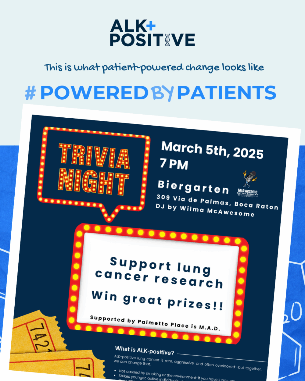 Working with Katie and the ALK Positive team made everything easier. We decided on a Trivia Night—something fun and new for my active community. With help from a local trivia DJ, we secured a date and a venue. Katie helped create the flyer, set up a fundraising page, and drafted a letter for canvassing local vendors for prizes.