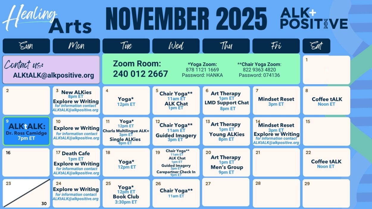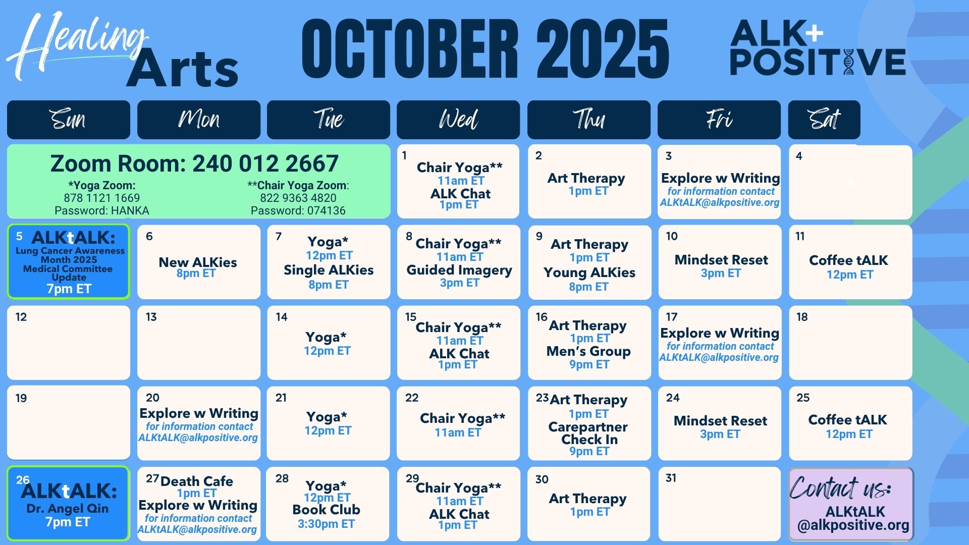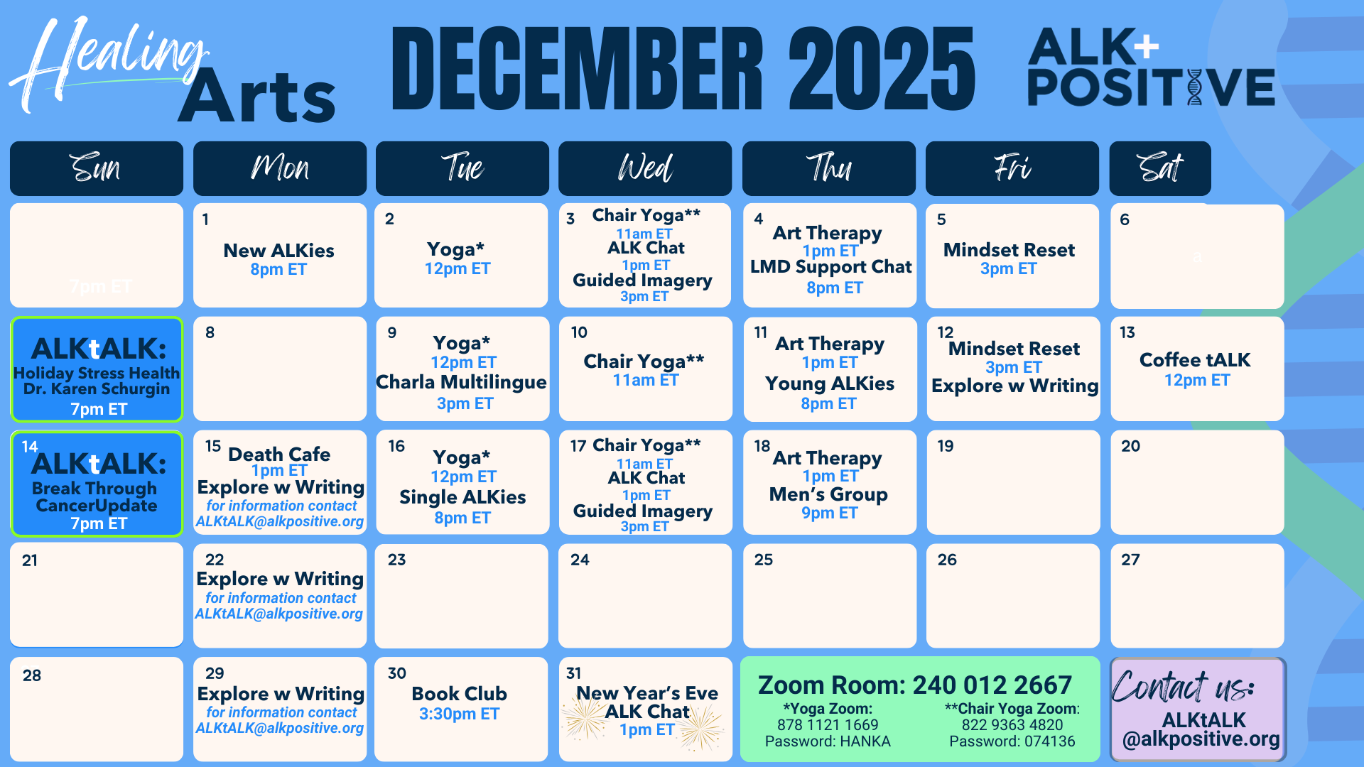 ALK+ Positive Healing Arts offers a supportive space for patients and care partners to connect, heal, and grow through creative and therapeutic practices. From art and writing to yoga and group discussions, these programs are led by compassionate facilitators who empower participants to find resilience, relaxation, and community while navigating the challenges of an ALK diagnosis.