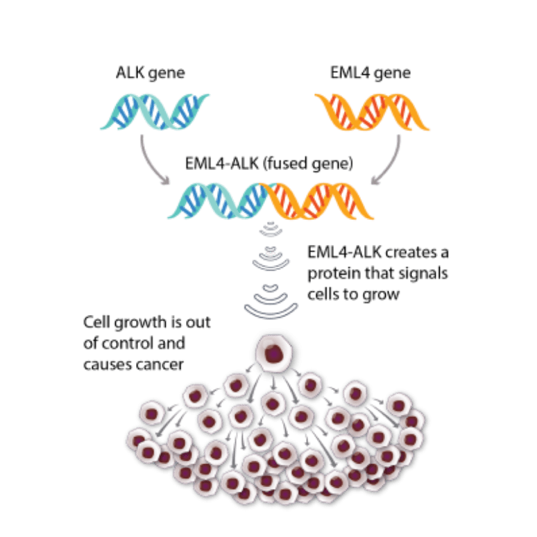 ALK-positive (ALK+) lung cancer most often starts in the lungs, but it can also start in other parts of the body. It happens when one of your ALK genes latches on (fuses) to another gene by mistake. That creates an abnormality – called an ALK gene fusion – that sends out faulty signals, making cancer cells grow. Cancer happens when these abnormal cells multiply out of control. Scientists aren’t sure why some people develop ALK+ cancer.